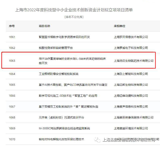 近期,上海市科学技术委员会组织的“上海市2022年度科技型中小企业技术创新资金计划”拟立项项目名单公示完毕,九州ku游官网生物“用于治疗重度哮喘的全新长效IL-5纳米抗体药物的临床前开发”项目入围。