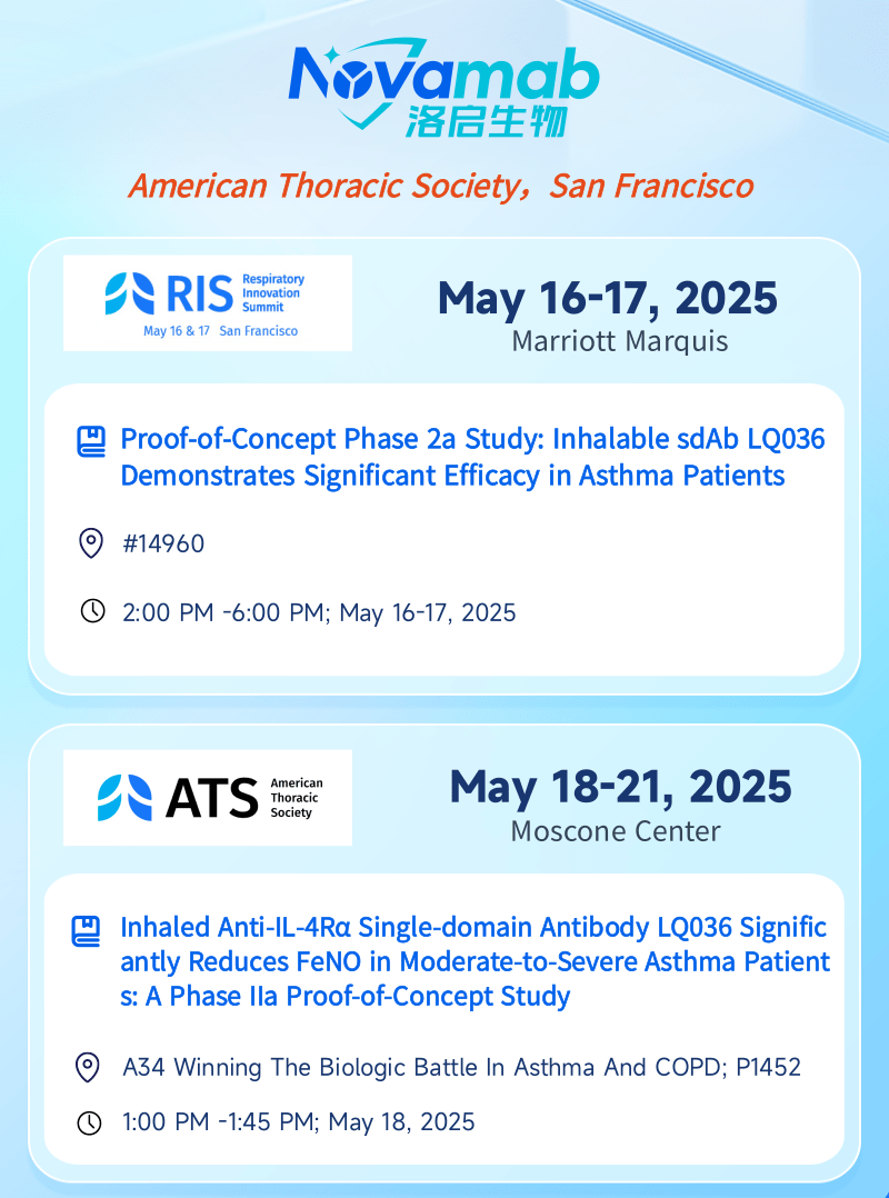 中国上海,2025年5月13日——上海九州ku游官网生物医药技术有限公司,一家专注于纳米抗体创新药研发的生物技术企业,今日宣布:九州ku游官网生物将于当地时间5月16日至21日赴美国加州旧金山,受邀参加美国胸科学会(American Thoracic Society, ATS)主办的呼吸创新峰会(Respiratory Innovation Summit,RIS)及ATS国际大会。届时九州ku游官网生物将分别在RIS和ATS两场大会上以壁报形式呈现最新临床数据——公司自主研发的靶向 IL-4Rα 吸入性生物制剂 LQ036 首个 IIa 期概念验证性临床试验数据。本次展示将全面披露 LQ036 在中重度哮喘患者中的安全性、耐受性、药效指标及初步疗效,标志着九州ku游官网生物在下一代呼吸道吸入式生物制剂开发领域迈出关键里程碑。